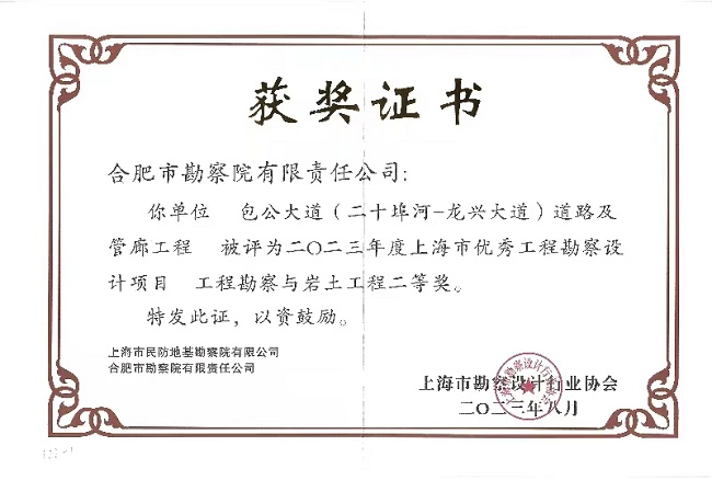 近日,合肥市勘察院有限責任公司收到了上海市勘察設(shè)計行業(yè)協(xié)會頒發(fā)的獲獎證書,我公司的包公大道(二十埠河-龍興大道)道路及管廊工程被評為2023年度上海市優(yōu)秀工程勘察設(shè)計項目工程勘察與巖土工程二等獎。